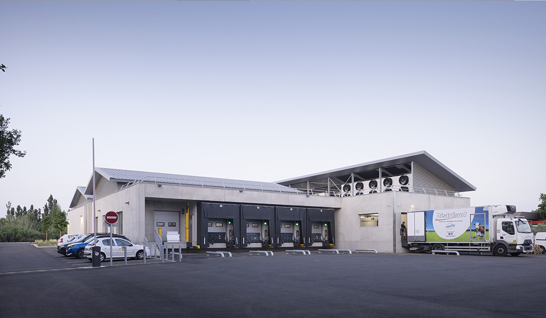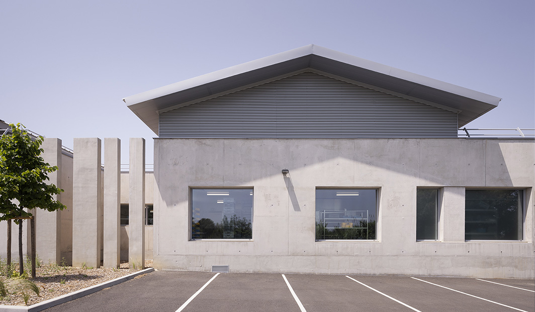 La compacité du bâtiment n’est pas ressentie par les usagers et visiteurs grâce aux vides des patios et à un jeu de toiture en pente (bac acier) semblant se poser délicatement sur la toiture plate. Cette disposition de toiture en pente nous permet d’éviter l’image d’un bâtiment monolithe mais répond aussi à des problématiques fonctionnelles. En effet, ces toitures servent de déflecteurs protégeant ainsi les zones de chargement/déchargement et les espaces de détente extérieurs des vents dominants.