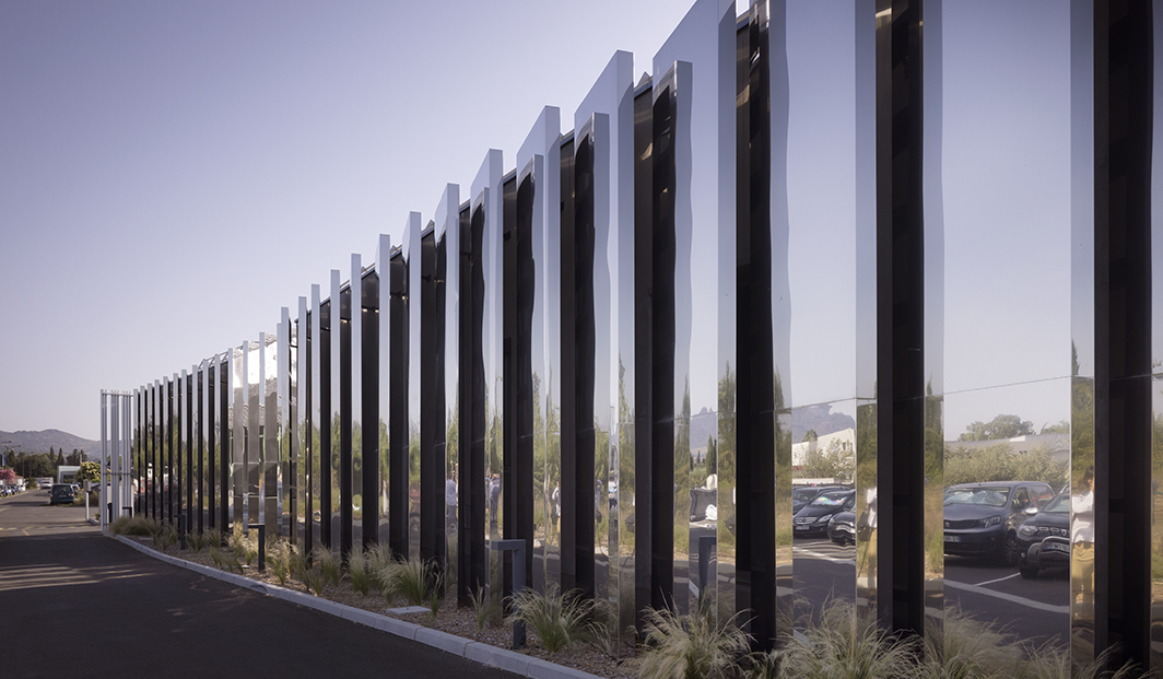 La façade cintrée au Nord est composée de lames métalliques au rythme aléatoire évitant ainsi de créer une frontalité bâtie trop brutale à l’entrée du site et permettant de dissimuler le local déchets tout en assurant une excellente ventilation. Ce rythme de pleins et de vides crée également une paroi acoustique face au groupe électrogène réduisant alors considérablement les nuisances sonores.