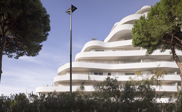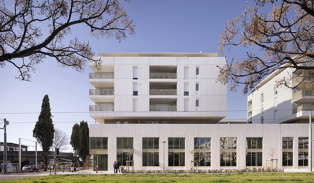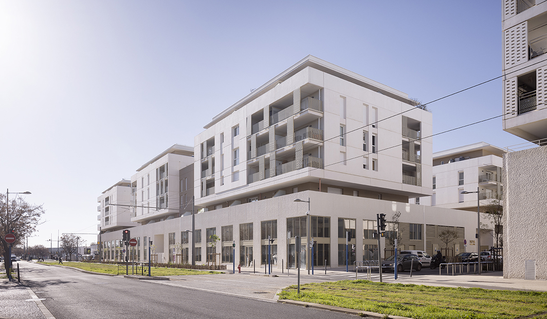 Si le socle, en béton blanc matricé, évoque la pierre, renforcé en cela par le rythme affirmé des vitrines, les différents plots qui le surmontent proposent un jeu entre une resille composée de volets repliables dont les lames seraient idéalement orientables par les occupants et de volumes en briques blanches enchâssés entre les balcons. Cette composition permet de composer avec la verticalité comme avec l’horizontalité de cet ilot dans le cadre d’une unité de matériaux.