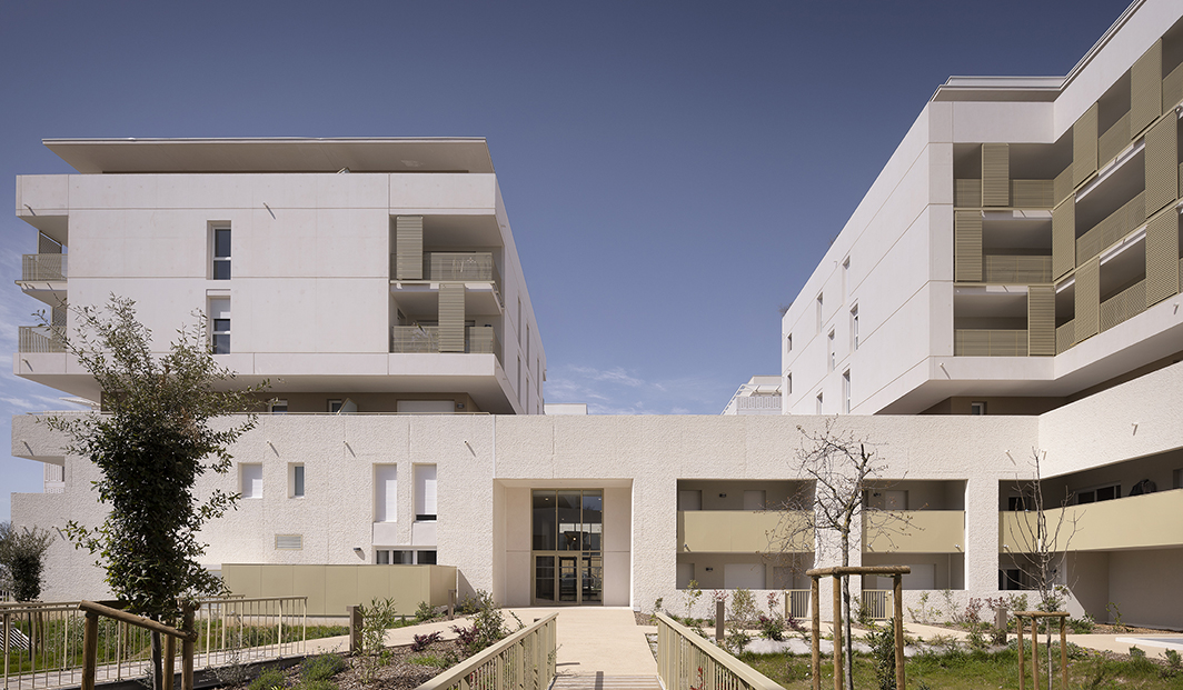 Les derniers étages forment des attiques ouverts sur le grand paysage que de fines dalles de béton protègent du soleil. Les fonds de certaines loggias seront enduits de couleur foncée afin d’apporter les contrastes suffisants à la lecture de notre composition. En cœur d’ilot, un vaste jardin aménagé s’ouvre au sud-ouest. Un réseau de cheminements piétons organise la liaison entre les halls traversants donnant sur rue et les espaces plantés et aménagés